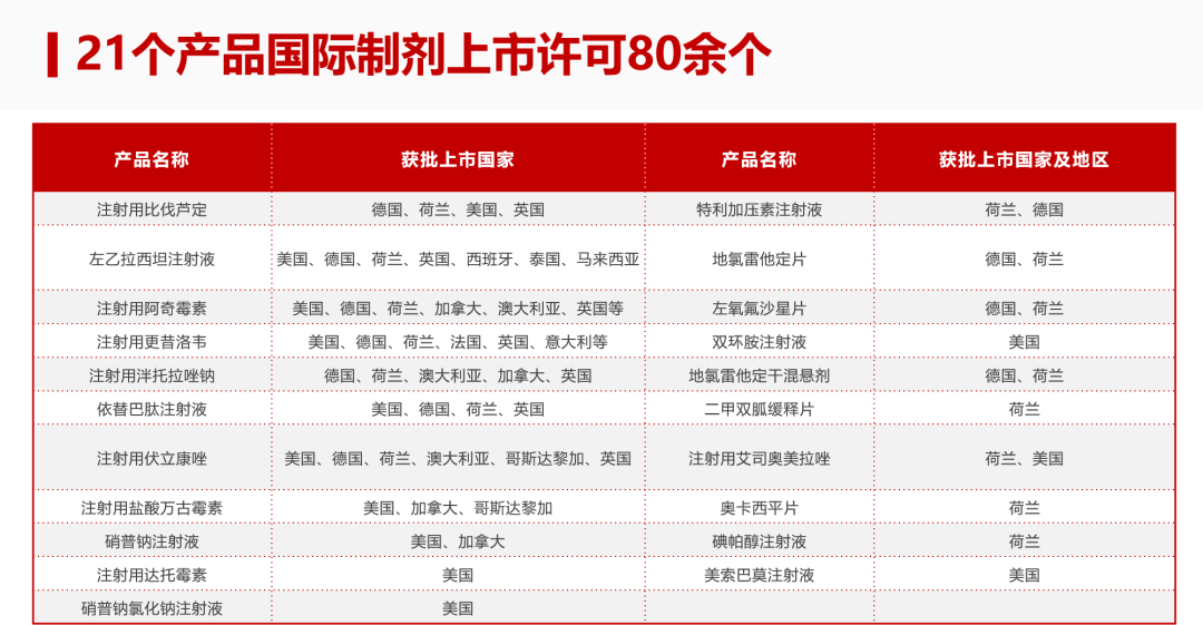 依托高标准质量管理以及高品质生产线,太阳成集团tyc122ccvip已有16个针剂和5个口服共计21个产品先后获得多个国家和地区的上市许可80余个,其中13款产品还实现了在国外获批上市的同时,在国内通过或者视同通过仿制药一致性评价。