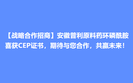 【战略合作招商】安徽普利原料药环磷酰胺喜获CEP证书,期待与您合作,共赢未来!